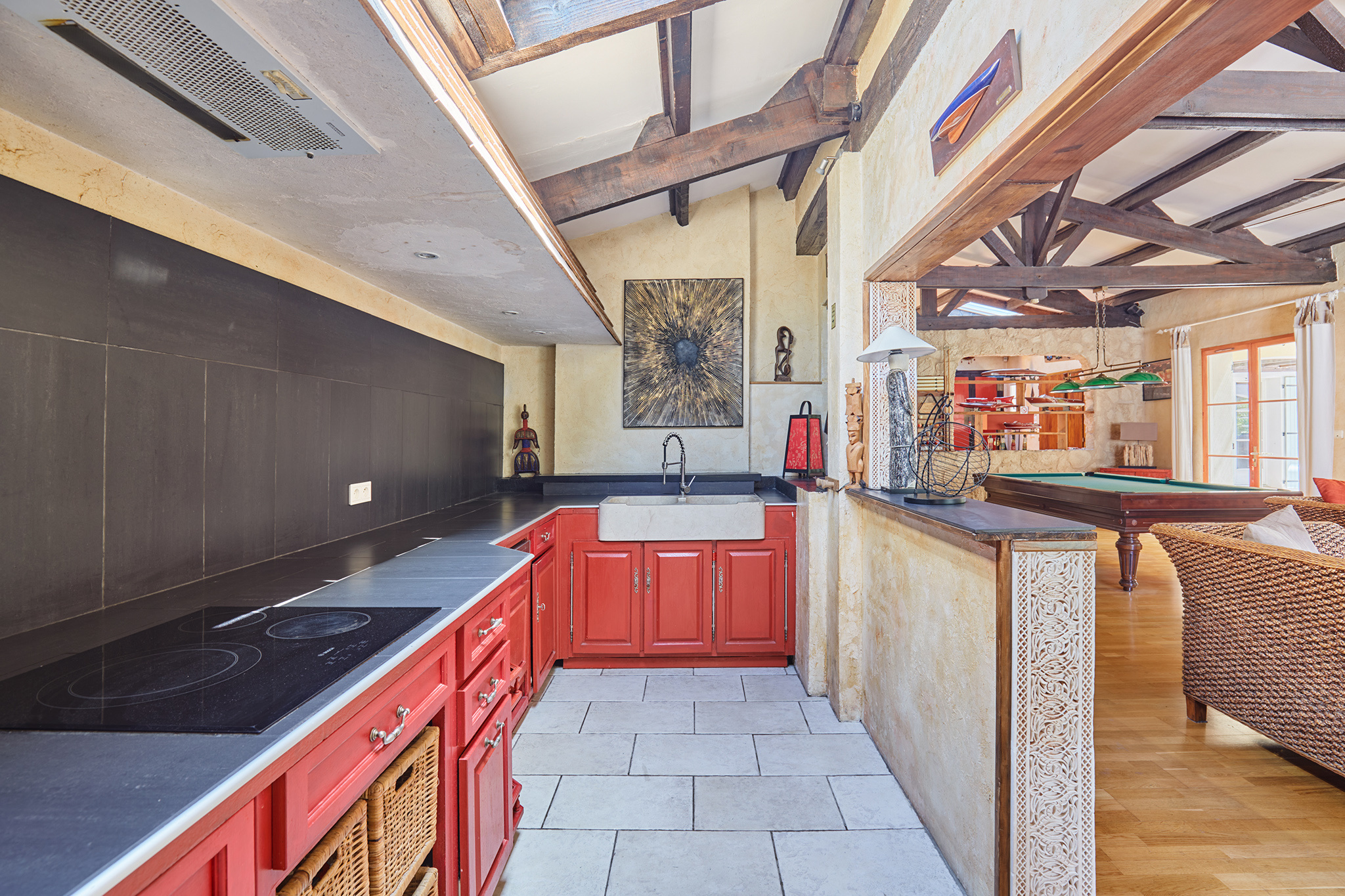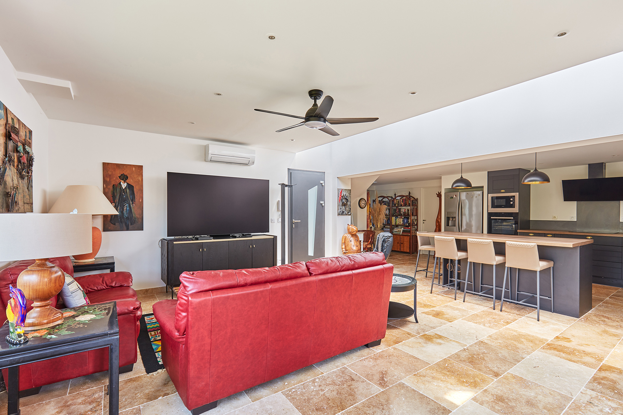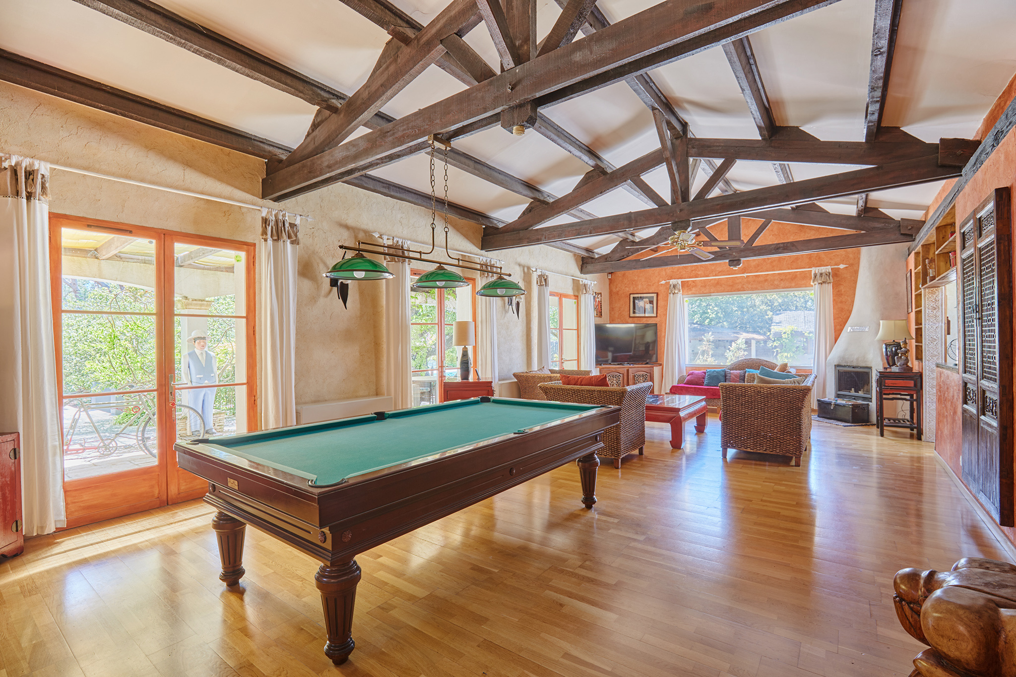 La maison principale, de plain-pied, développe une surface généreuse de 250 m2. Elle offre de très beaux volumes, avec un séjour lumineux de 65 m2, une cuisine équipée ouverte sur une salle à manger, un bureau et un atelier de peinture. L’espace nuit se compose d’un salon TV/bibliothèque cosy, de quatre grandes chambres, dont une suite parentale de 29 m2 avec accès direct à la piscine. Une salle d’eau de 6 m2 et une salle de bain spacieuse de 14 m2 complètent cet espace de vie confortable.