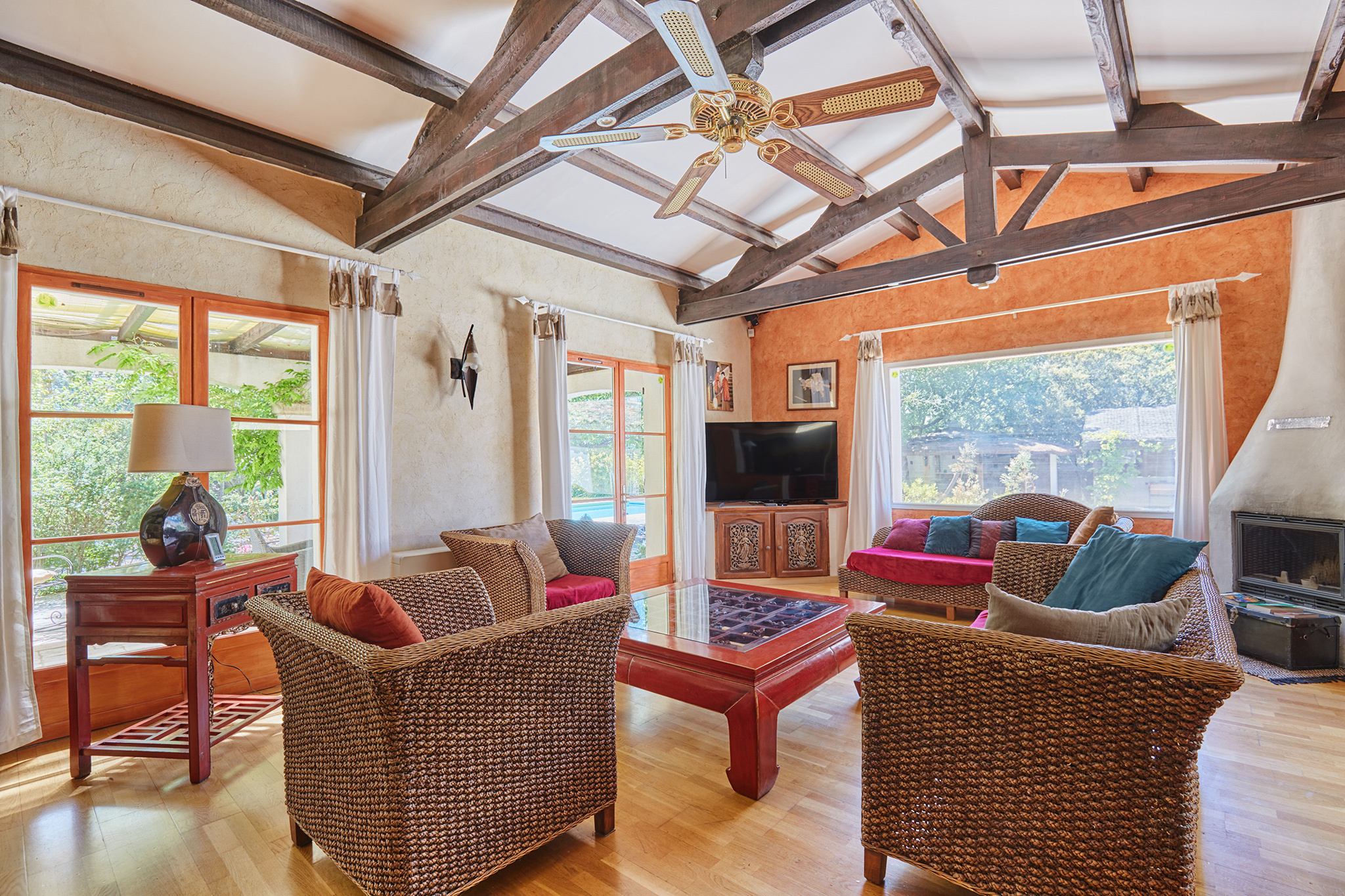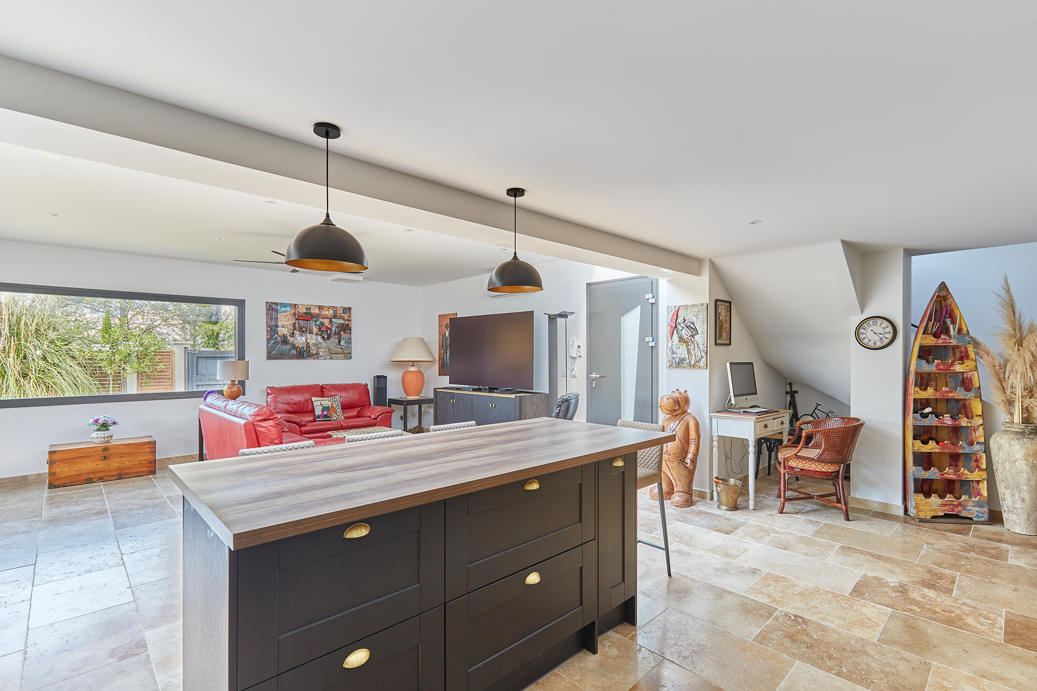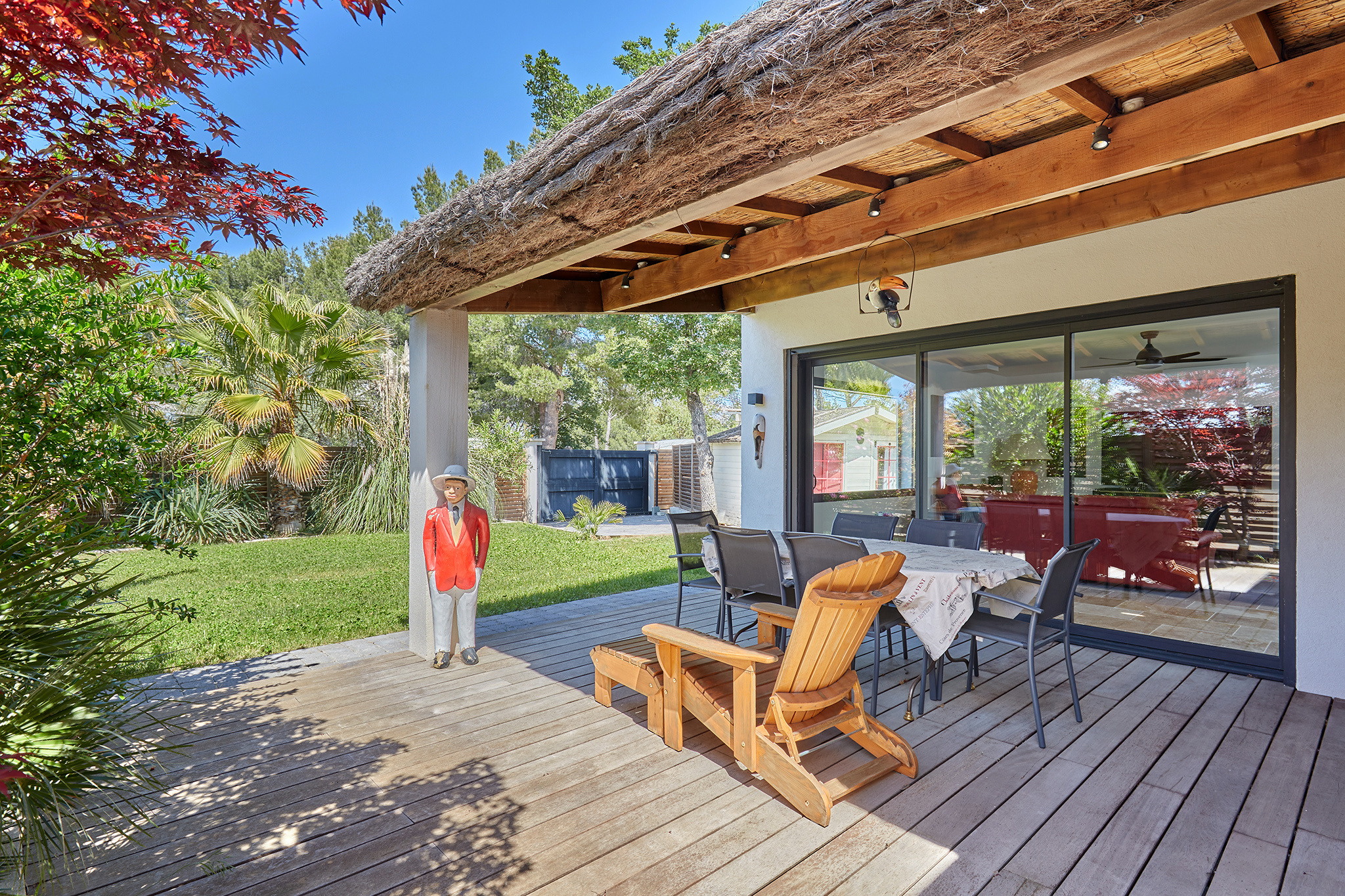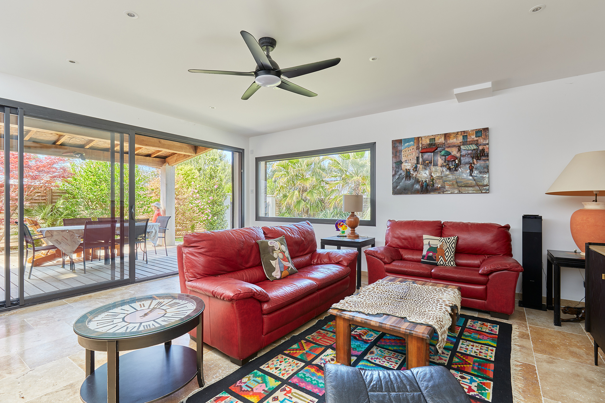La maison principale, de plain-pied, développe une surface généreuse de 250 m2. Elle offre de très beaux volumes, avec un séjour lumineux de 65 m2, une cuisine équipée ouverte sur une salle à manger, un bureau et un atelier de peinture. L’espace nuit se compose d’un salon TV/bibliothèque cosy, de quatre grandes chambres, dont une suite parentale de 29 m2 avec accès direct à la piscine. Une salle d’eau de 6 m2 et une salle de bain spacieuse de 14 m2 complètent cet espace de vie confortable.